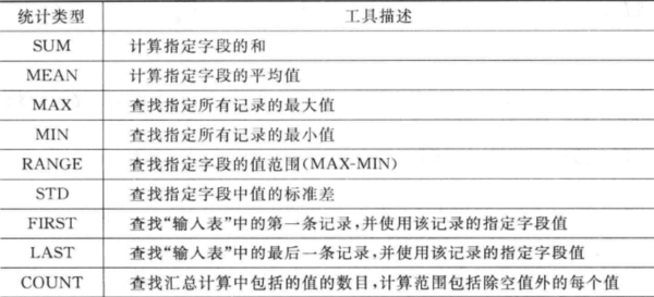 汇总统计(summary statistics)数据就是对输入表格中的字段进行汇总计算,输出结果为表格,表格由包含统计运算结果的字段组成。在输出表格中,使用“统计类型   字段名称”命名约定来为每种统计类型创建字段,可用的统计类型如表所示。当输出表为dBASE表时,字段名称会被截断为10个字符。