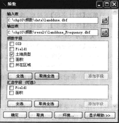 (1)在ArcToolbox中双击【分析工具】→【统计分析】→【频数】,打开【频数】对话框,如图所示。