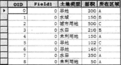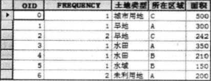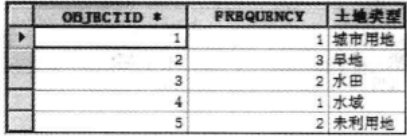 (4)单击【确定】按钮,完成频数统计操作,运行结果如图所示。【FREQUENCY】字段记录的是土地利用类型的唯一值频数。其结果为:城市用地1块、旱地3块、水田2块、水域1块、未利用地2块。