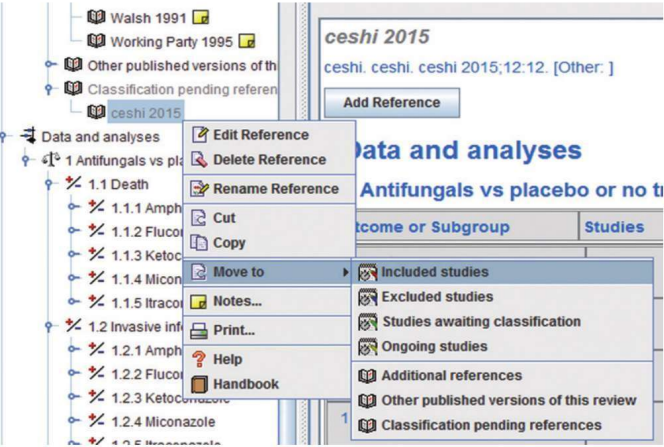 选择“Move to>Classification pending references”, 通过在“Classification references”中找到这条参考文献,右击选择“Move to>Included(如图所示),将会在相应位置自动根据引用信息添加一个研究。